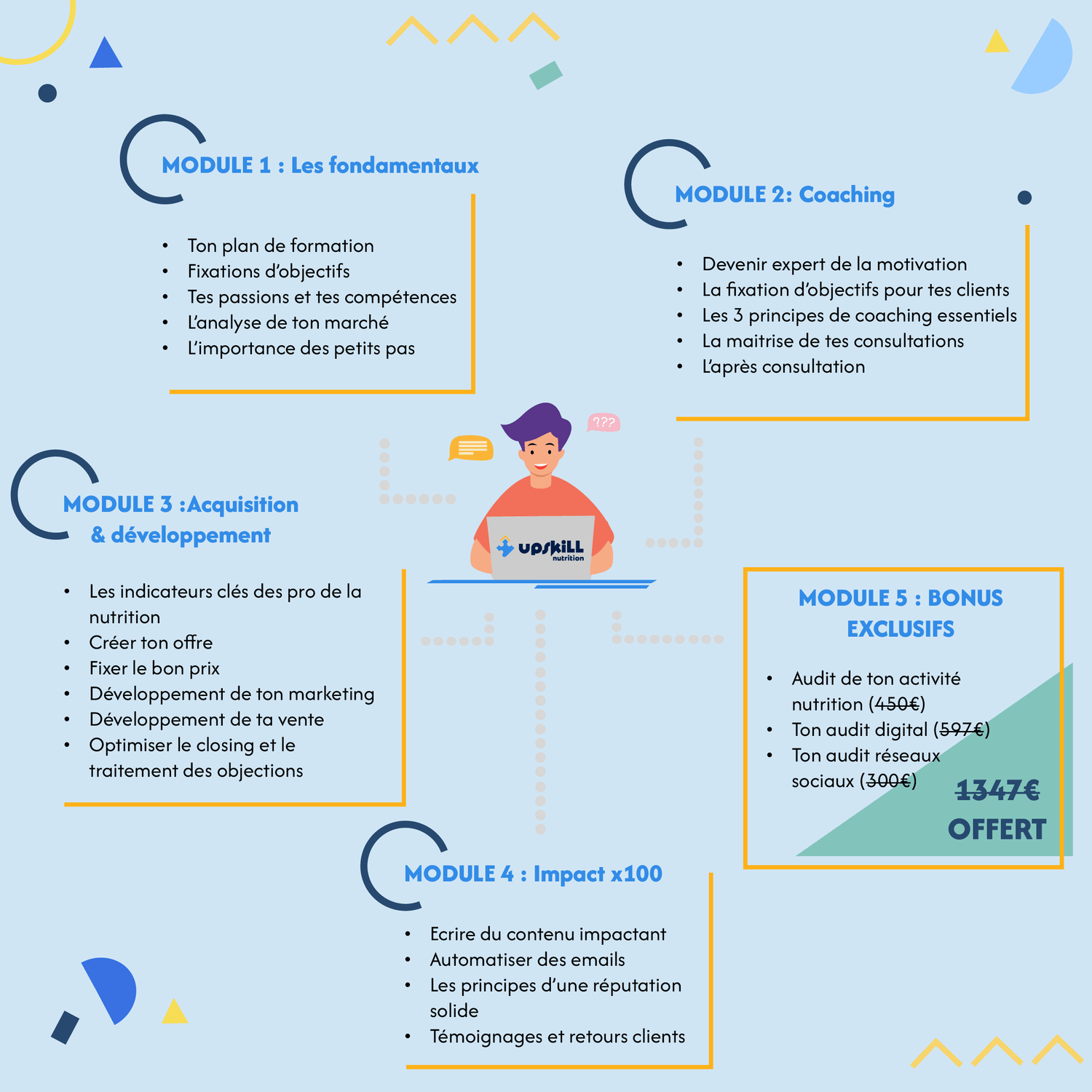 Plus de 25 leçons, remplies de concepts, d’outils et de stratégies immédiatement exploitables pour développer votre activité de professionnel de la nutrition et augmenter votre chiffre d’affaires.